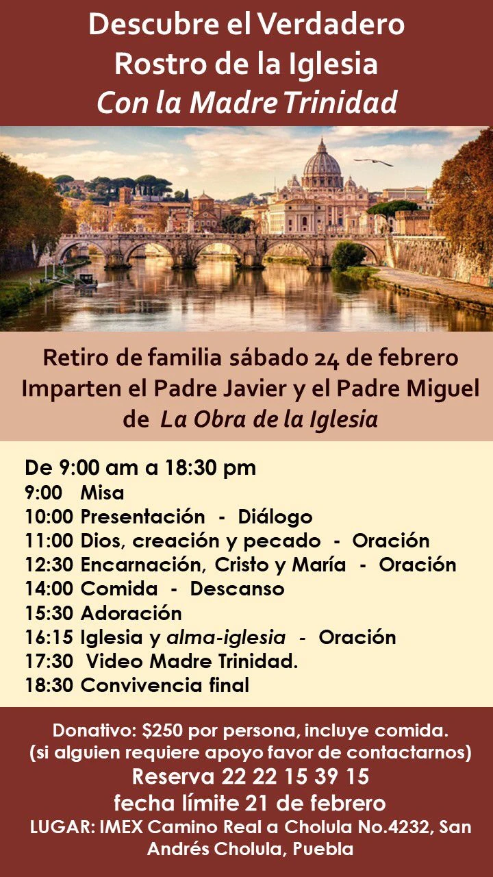 En una iniciativa destinada a “descubrir el verdadero rostro” de la Iglesia Católica, sacerdotes de Roma, pertenecientes a la Obra de la Iglesia, llevarán a cabo un retiro los días 24 de febrero y 2 de marzo en Puebla y Ciudad de México.