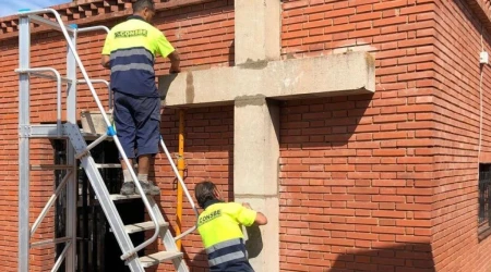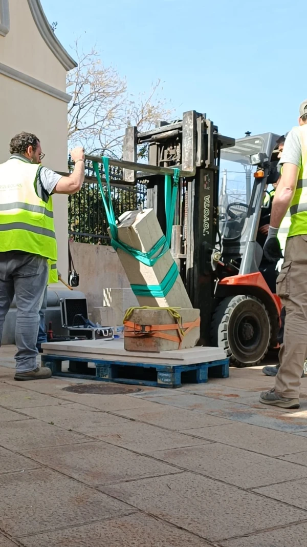 Los operarios tuvieron que desmontar pieza a pieza la cruz de la pared del lugar en el que son enterrados los párrocos en el cementerio municipal. Luego los trasladaron con una grúa y los situaron a las puertas del recinto que guarda la Ermita del Calvario, cuya construcción data de la segunda mitad del siglo XVIII.