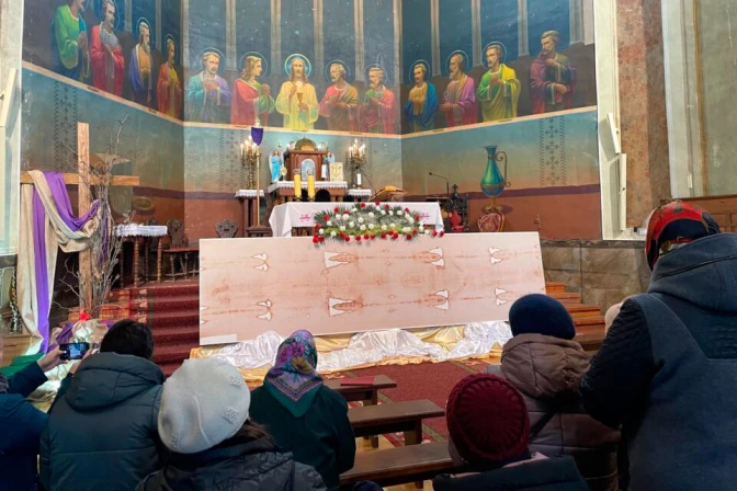 Desde hace unos días una réplica de la Sábana Santa está en Ucrania, país que sufre la guerra desde la invasión de Rusia en febrero de 2022, en donde alienta la fe de los católicos que lloran a sus seres queridos fallecidos durante este conflicto que lleva más de dos años.