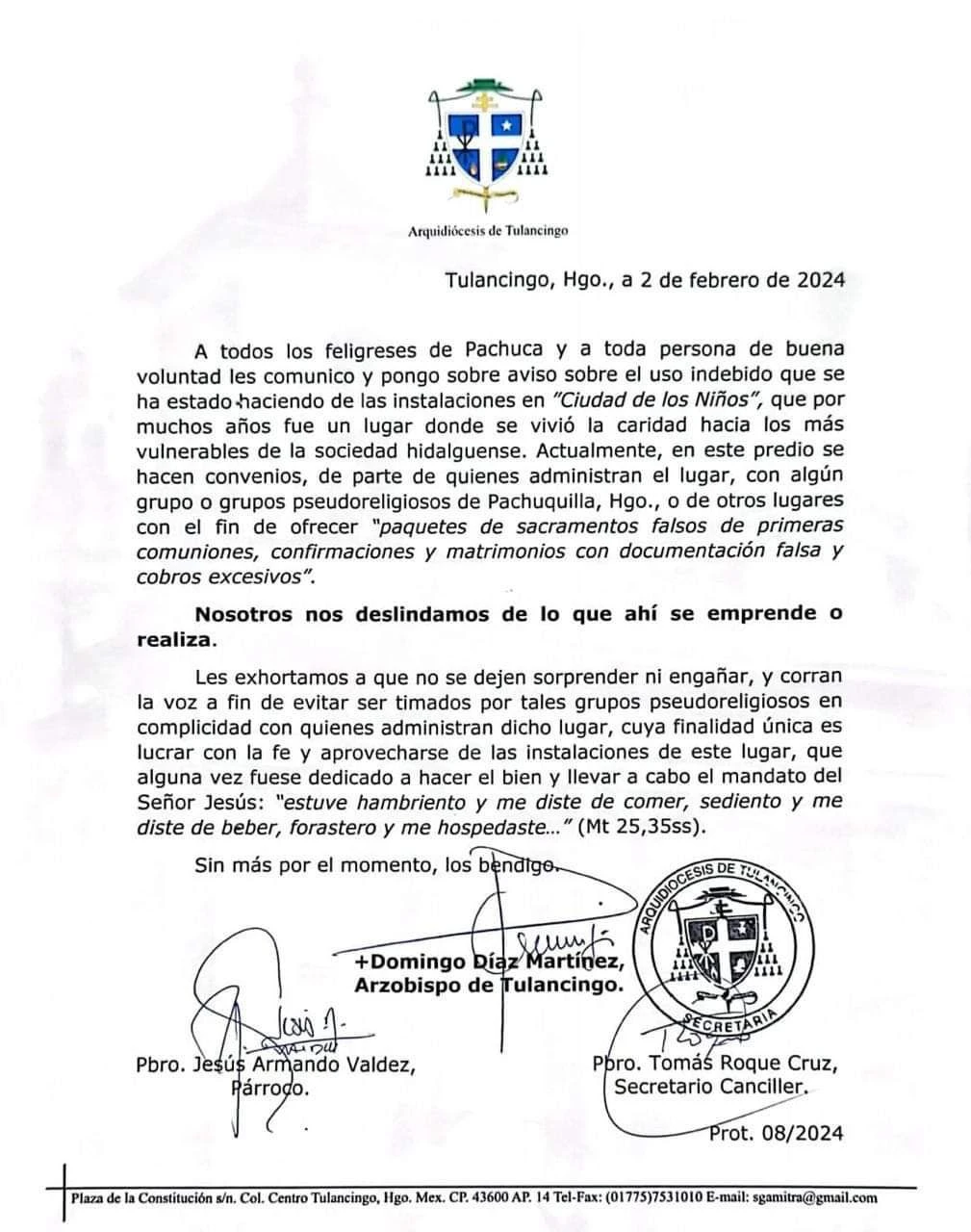 En su comunicado, Mons. Díaz Martínez indicó que la Ciudad de los Niños “alguna vez” estuvo “dedicada a hacer el bien y llevar a cabo el mandato del Señor Jesús”, pero denunció que “actualmente, en este predio se hacen convenios, de parte de quienes administran el lugar, con algún grupo o grupos pseudoreligiosos (...) con el fin de ofrecer ‘paquetes de sacramentos falsos de primeras comuniones, confirmaciones y matrimonios con documentación falsa y cobros excesivos’".