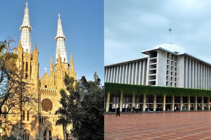 La catedral de Nuestra Señora de la Asunción, principal lugar de culto católico de la capital indonesia y sede del arzobispo de Yakarta, está situada frente a la mezquita Istiqlal, la más grande del Sudeste Asiático.