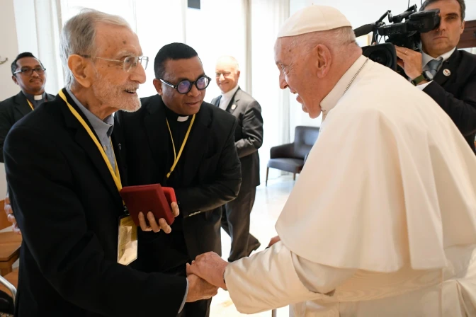 Lo primero que hizo el Papa Francisco al entrar en la sala fue abrazar y agradecer por su servicio al anciano sacerdote portugués que vive en Timor Oriental desde la ocupación indonesia.