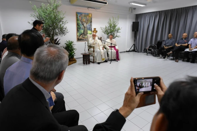 Al término de la reunión, uno de los sacerdotes se acercó al Papa Francisco con varias bolsas que contenían numerosas peticiones escritas por los fieles del país. El Santo Padre posó su mano sobre ellas y oró en silencio.