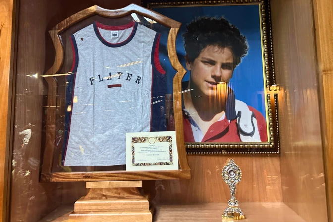 Dos reliquias de Carlo Acutis, próximo a ser canonizado, están expuestas en la Basílica de Nuestra Señora de Guadalupe, en la Ciudad de México: un mechón de su cabello y una de sus playeras deportivas.