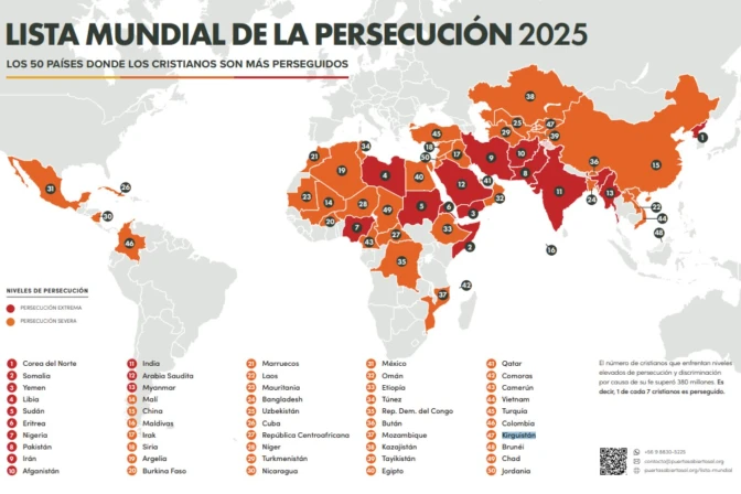 La organización evangélica Puertas Abiertas publicó su Lista Mundial de la Persecución 2025, en la que presentan los 50 países del mundo más peligrosos para los cristianos, en donde “seguir a Cristo puede costar la vida”.