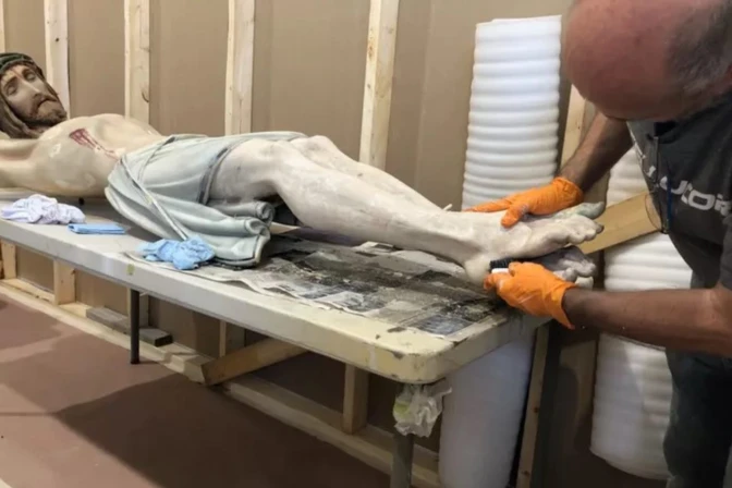 “Tenía un gran cuerpo ennegrecido por el humo en su coche y bromeaba diciendo que Jesús quería invitarnos a una taza de café”, dijo Clark al Register. “Cuando me enteré de que el crucifijo provenía de nuestra antigua parroquia y que el trabajo en el proyecto se estaba ralentizando por falta de fondos y trabajadores, ofrecí mi ayuda no especializada”.