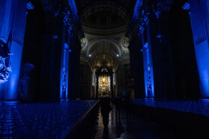 Los afortunados pudieron recorrer la basílica sin apenas luz, guiándose por los destellos que emanaban de la vidriera del Espíritu Santo desde el Altar de la Confesión, los candelabros sobre la tumba de San Pedro y por la sutil iluminación azulada sobre las estatuas laterales que guiaban a los fieles hasta el baldaquino.
