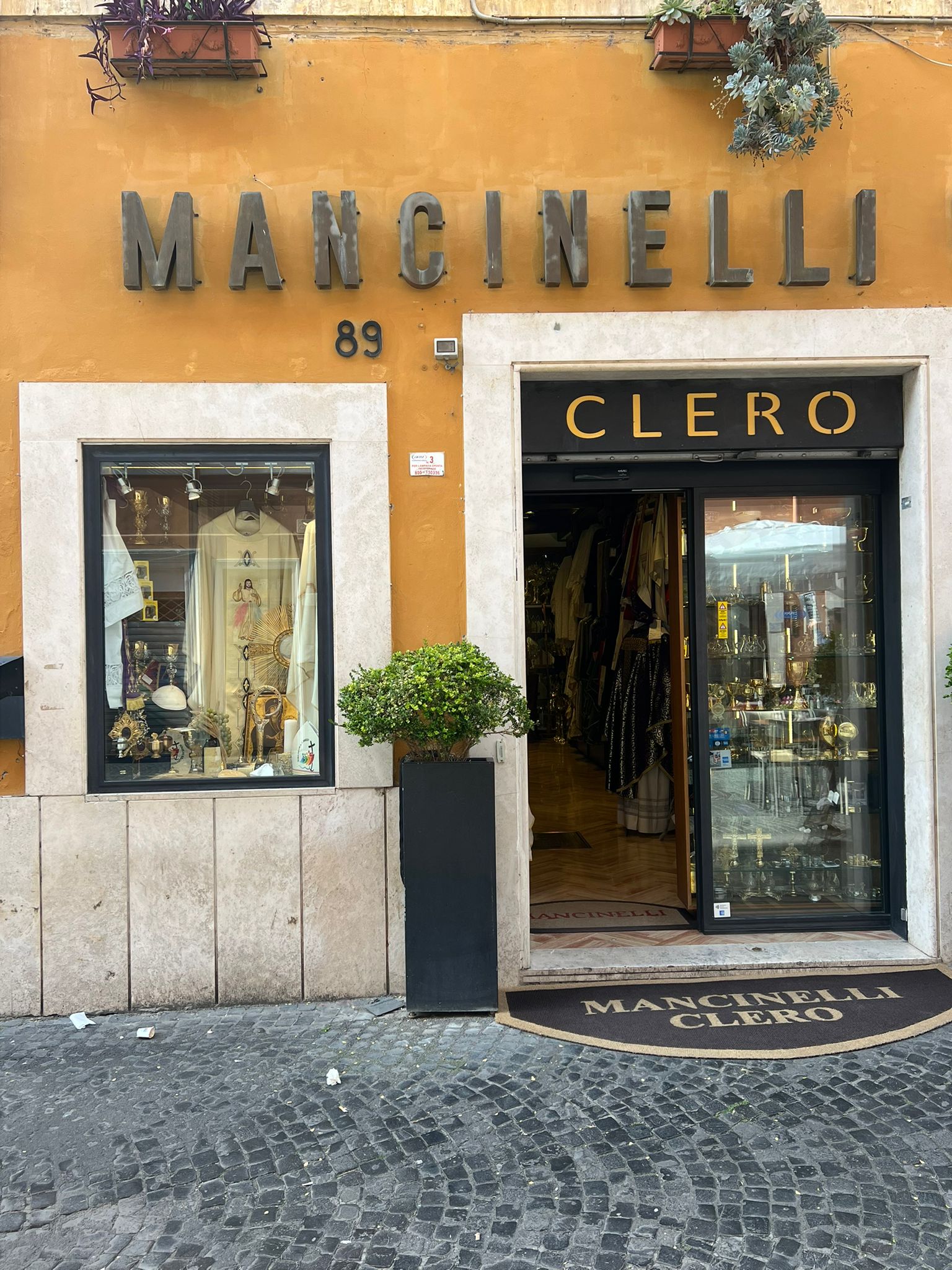 En el número 89 de la calle de Borgo Pío, situada a pocos pasos de la puerta Santa Ana que conduce al Vaticano, se encuentra Mancinelli Clero, la icónica tienda que representa la historia y tradición de la sastrería eclesiástica en Roma.