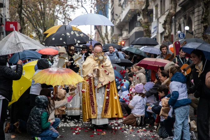 Av. del Libertador y Mercedes fue la esquina donde este domingo los católicos de Montevideo se dieron cita para, pese a la lluvia, participar de la tradicional procesión de Corpus Christi, la fiesta de mayor tradición en la capital uruguaya, cuyos comienzos datan de la época colonial.