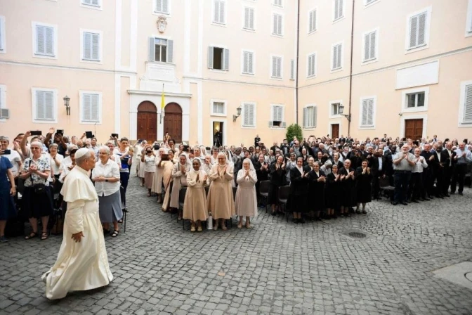 El Santo Padre llegó a la villa pontificia el pasado 6 de julio, para su descanso veraniego que se extenderá hasta el 20 de julio. Después regresará del 15 al 17 de agosto. En el patio del recinto, quiso reflexionar hoy junto a superiores generales, consejos y miembros de estas ocho congregaciones.