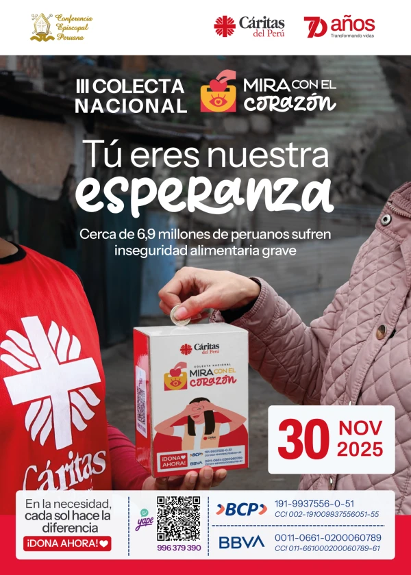 La Conferencia Episcopal Peruana (CEP), a través de Cáritas del Perú, anunció la tercera edición de la colecta nacional “Mira con el Corazón: Tú eres nuestra esperanza”, una cruzada solidaria que busca movilizar a todo el país en favor de quienes más lo necesitan.