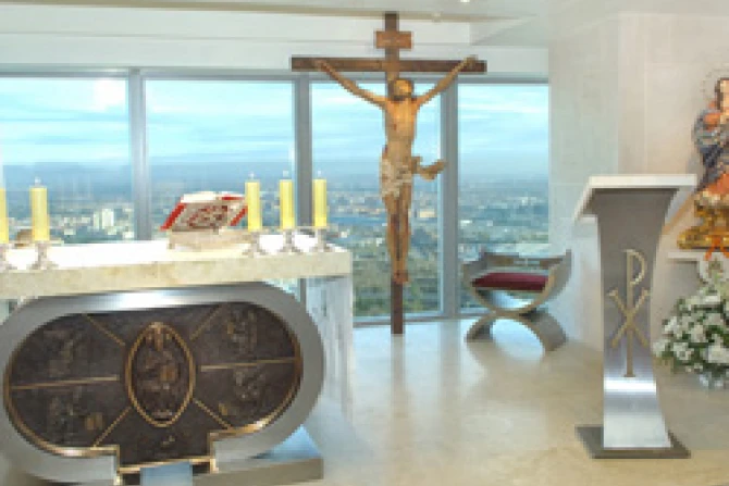 Torre Espacio, ubicado en el nuevo centro empresarial y financiero de la capital denominado Cuatro Torres, es un edificio de 236 metros de altura y 57 plantas. La capilla, en la que se celebra Misa todos los días y a la que asisten masivamente los empleados, fue concebida sin ninguna intención de batir récord mundial y se encuentra a 135 metros sobre el nivel del suelo, con vista a la sierra y al norte de la capital.