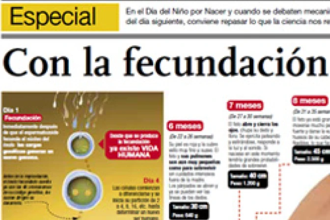 Con el título "Con la fecundación, la vida", este informe explica que "en el Día del Niño por Nacer y cuando se debaten mecanismos que permiten el aborto, como la píldora del día siguiente, conviene repasar lo que la ciencia nos revela respecto al comienzo de la vida humana".