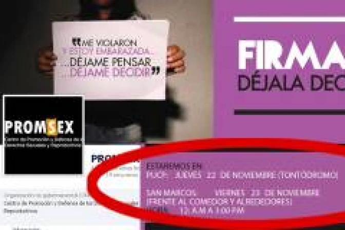 Los abortistas acudieron a la ex PUCP luego de una convocatoria lanzada desde el sitio de Facebook de Promsex, una ONG que promueve la despenalización de esta práctica en el Perú desde hace 10 años. Este vez usaron como pretexto el Día Internacional de la No violencia contra la mujer que se celebra el lunes 25 de noviembre.