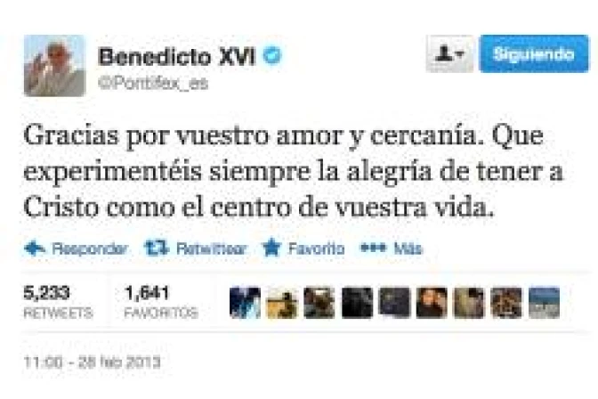 El Papa Benedicto XVI tuiteó desde su cuenta un mensaje de agradecimiento a todos y de aliento a que el Señor sea el centro de la vida.