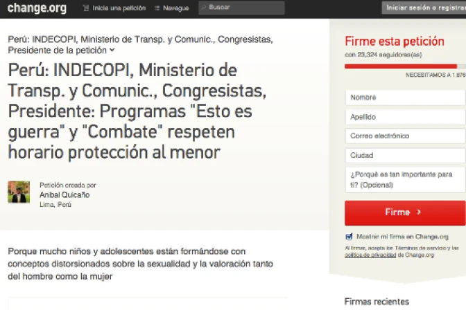 Más de 25 mil personas han firmado a la fecha una petición a las autoridades peruanas para que actúen frente a la difusión en televisión de programas que promueven "conceptos distorsionados sobre la sexualidad y la valoración tanto del hombre como la mujer" en niños y adolescentes.