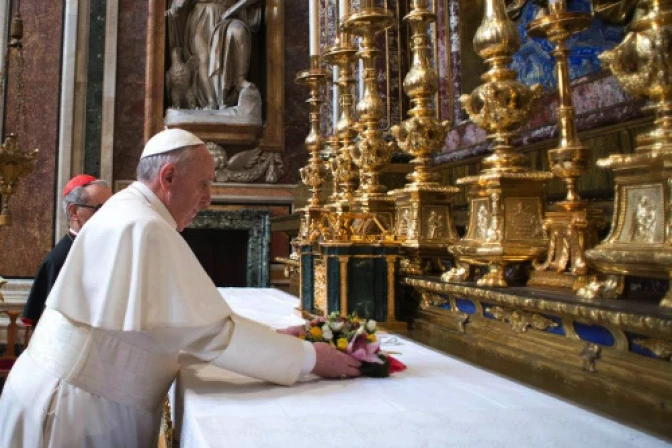 El Papa dejó una pequeña ofrenda floral que él mismo portó hasta el altar de la Salus Populi Romana, la advocación de la Virgen María que está en esta Basílica.