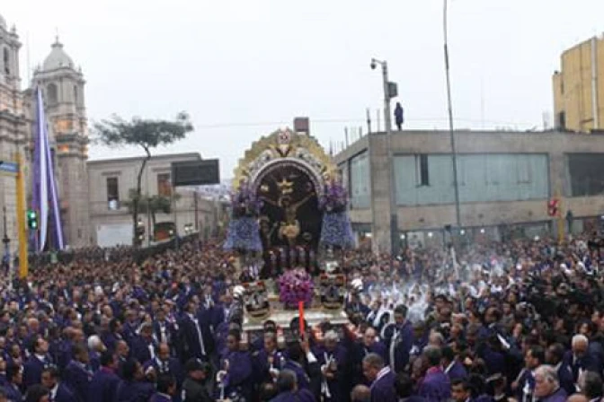 La venerada imagen del Señor de los Milagros avanza en procesión por las calles del centro de Lima en Perú, con dirección a la Catedral local en donde se celebrará el tradicional "Sermón de las Siete Palabras".