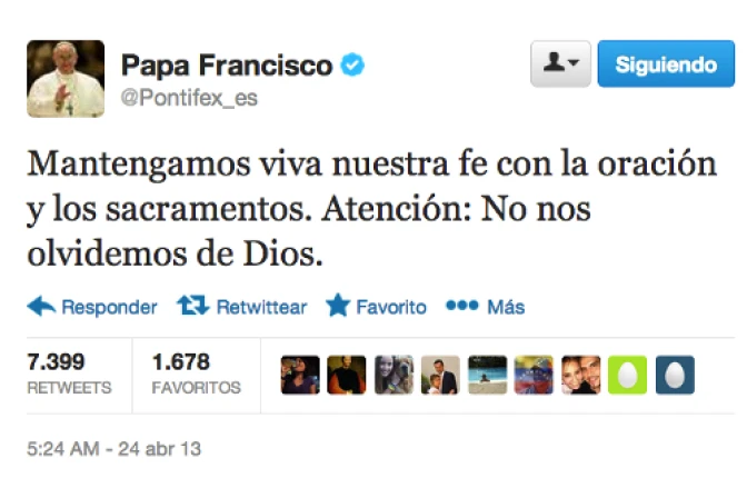 "Mantengamos viva nuestra fe con la oración y los sacramentos. Atención: No nos olvidemos de Dios", de esta manera el Papa resumió la catequesis de hoy para sus más de seis millones de seguidores que lo leen en nueve idiomas.