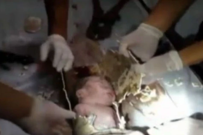 Los bomberos removieron desde el piso inferior la parte de la tubería en la que estaba el bebé. Trataron de sacarlo pero no pudieron por lo que llevaron ese trozo de tubo al hospital donde después de dos horas los médicos consiguieron liberarlo serruchando el tubo. de 10 centímetros de diámetro. El pequeño fue puesto luego en una incubadora.