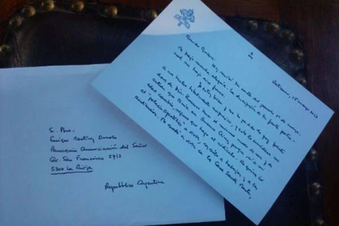 La carta escrita de puño y letra del Papa, dada a conocer por la agencia AICA, fue dirigida al Padre Enrique Martínez, párroco de la Anunciación del Señor, en el barrio Cochangasta, de la diócesis de La Rioja en Argentina.