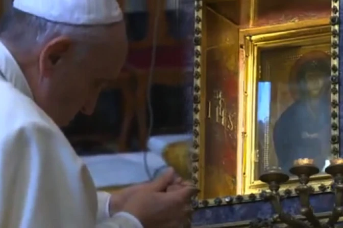 Francisco entró al templo por la puerta lateral , y se dirigió a la capilla con la imagen de la Virgen "Salus Populi Romani" (Protectora del Pueblo Romano), precisamente la misma que, en una copia contemporánea, es uno de los iconos de la Jornada Mundial de la Juventud, tras ser donada por Juan Pablo II en 2003.