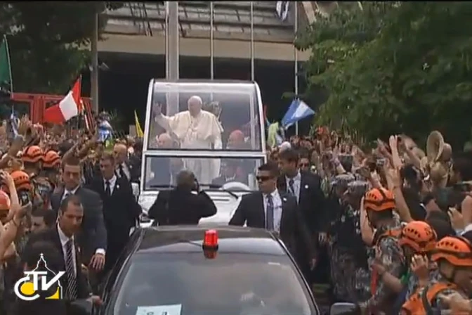 Debido a un error de la comitiva, el primer tramo de este viaje resultó accidentado porque el vehículo debió detenerse varias veces por el tráfico. Decenas de jóvenes trataron de acercarse al Pontífice y pusieron en aprietos a los miembros de seguridad.