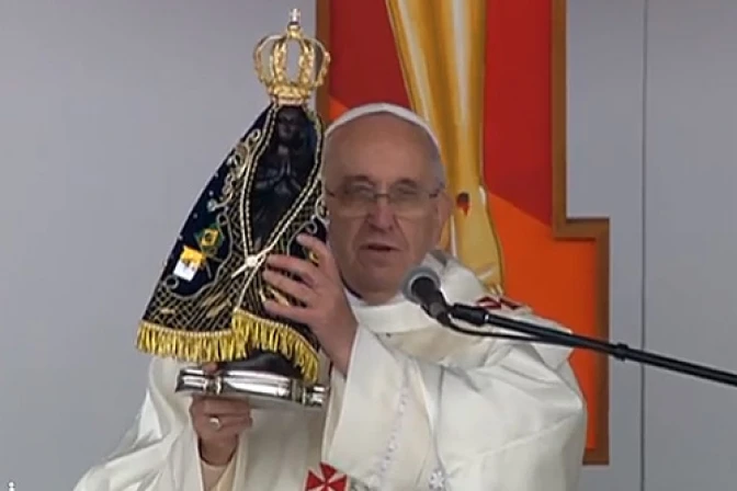 Tras saludar a los fieles y autoridades que estaban dentro del Santuario de Nuestra Señora de Aparecida, el Papa Francisco se acercó al balcón del templo acompañado de la réplica que recibió de regalo e improvisó un breve discurso en español en el que recordó que María "no se olvida de nosotros".