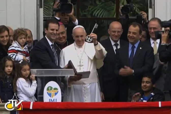 El Papa Francisco recibió este jueves las llaves de Río de Janeiro (Brasil), de manos del alcalde Eduardo Paes durante una breve ceremonia en el Palacio de la Ciudad, donde posteriormente bendijo dos imágenes religiosas, así como la bandera olímpica y la bandera paraolímpica de los juegos Río 2016.