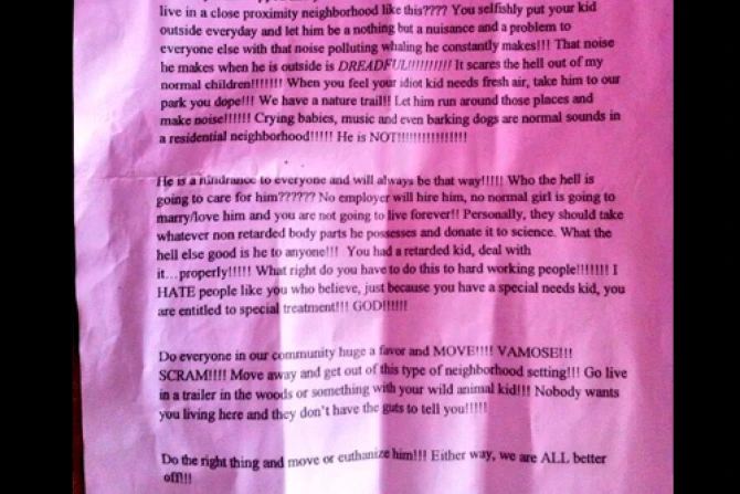 En la carta, la "madre enojada" -como firma la misiva-, critica a la abuela del menor con autismo por "conscientemente decidir que sería una buena idea vivir cerca de un vecindario como éste".