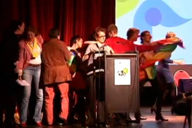 Boutin fue acosada por las feministas que gritaban "¡Boutin, caca!" y "¡Vivan los pederastas!" y fue cubierta con una bandera de los colores del arcoíris que representa a la comunidad gay, en ese momento un hombre subió al estrado y embarró el rostro del Prelado con la torta, según informó Religión y Libertad