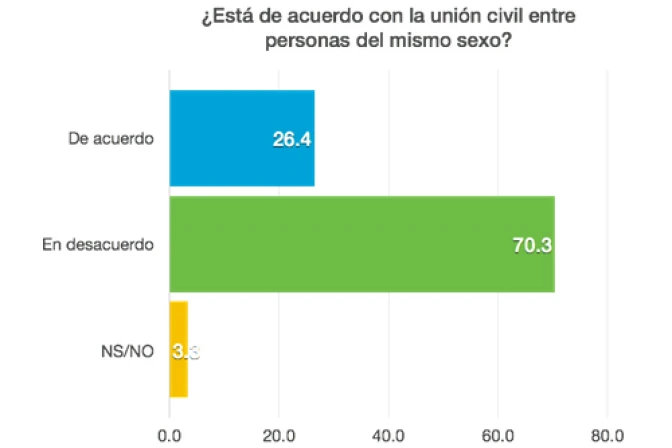 A la pregunta "¿está usted de acuerdo o en desacuerdo con la unión civil entre parejas del mismo género para que tengan los mismos derechos de un hombre y una mujer unidos por el matrimonio, propuesto por el congresista Carlos Bruce en el Congreso de la República?", el 70,3 por ciento de peruanos expresó su desacuerdo, contra solo un 26,4 por ciento que aprobó la iniciativa legislativa.
