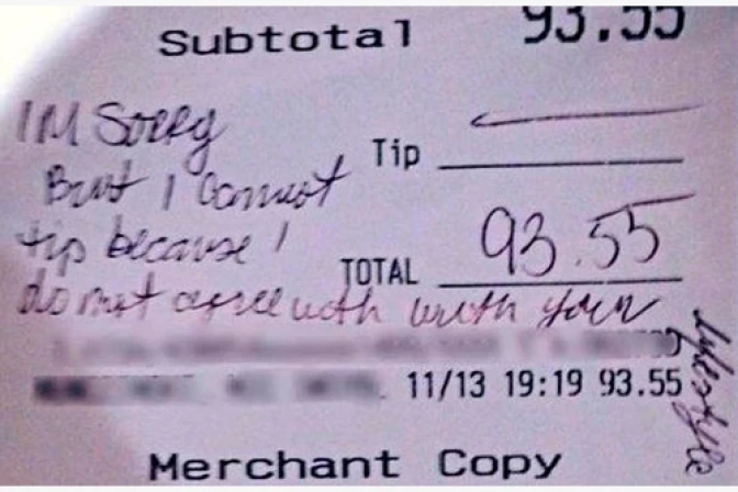 La foto mostraba un consumo de 93.55 dólares y un escrito a lapicero: "lo siento, pero no puedo darle propina porque no estoy de acuerdo con su estilo de vida y la manera en que vive su vida".