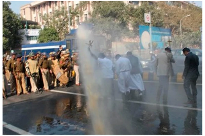 La policía usó potentes cañones de agua sucia a presión contra los manifestantes y metió en furgones y autobuses a los líderes de la manifestación, arrestando al Arzobispo de Nueva Delhi, Mons. Anil Couto, los obispos protestantes Alwan Masih (anglicano) y Roger Gaikwad, el líder evangélico Vijayesh Lal y el católico John Dayal, secretario general del All India Christian Council, entre otros líderes.