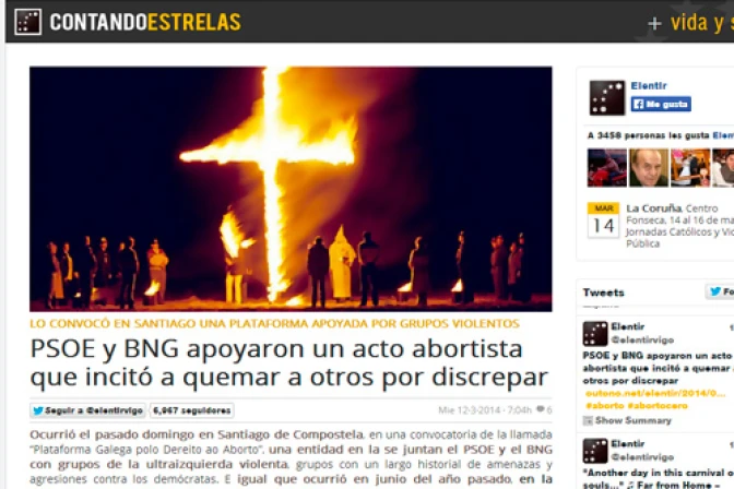 El blog Contando Estrellas denunció que en una marcha realizada el 9 de marzo, en Santiago de Compostela (España), la Plataforma Gallega por el Derecho al Aborto, que cuenta con el ex gobernante Partido Socialista Obrero Español (PSOE) entre sus miembros, alentó a quemar la sede de la Conferencia Episcopal Española.