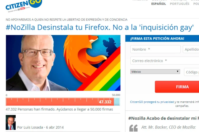 A través de la plataforma CitizenGo, más de 47 mil personas han llamado a un boicot contra el navegador Mozilla Firefox, luego de que su compañía matriz, la fundación Mozilla, cediera a las presiones del lobby gay, que forzó la renuncia de su recién nombrado CEO (jefe ejecutivo), Brendan Eich, por haber realizado una pequeña donación a una campaña pro familia.