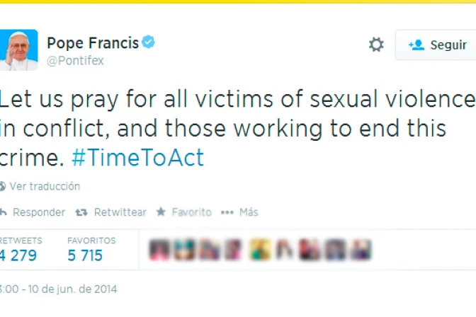 A través de su cuenta de Twitter, @Pontifex, el Papa Francisco exhortó este martes a actuar contra la violencia sexual en zonas de conflicto y orar por las víctimas de este crimen, en el marco de la Cumbre Mundial de Londres que se realiza hasta el 13 de junio.