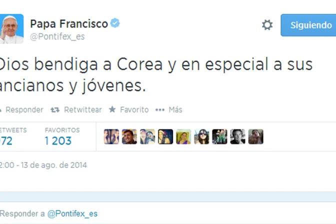 En su primera publicación en la red social Twitter a su llegada al aeropuerto de Gimpo, en Seúl (Corea del Sur), el Papa Francisco pidió la bendición de Dios para este país asiático, de forma especial para sus ancianos y sus jóvenes.