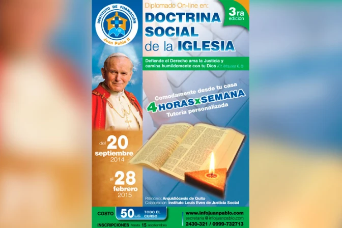 Con el patrocinio de la Arquidiócesis de Quito (Ecuador), y con la colaboración del Instituto Louis Even de Justicia Social, de Canadá, el Instituto de Formación Juan Pablo II ha organizado un diplomado online sobre Doctrina Social de la Iglesia.