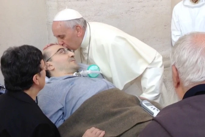 Confinado a una cama desde los 24 años debido a un accidente mientras practicaba judo, el italiano, ahora de 40 años, fue el primero en ser saludado por el Papa Francisco cuando este salió a dar la bienvenida a los peregrinos.