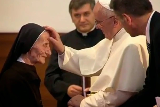 Durante el encuentro que sostuvo hoy el Papa Francisco con los sacerdotes, religiosos, religiosas, seminaristas y movimientos laicales en la Catedral San Pablo de Tirana, la hermana religiosa Franciscana Estigmatina, Sor María Kaleta (85) relató cómo en medio del brutal régimen comunista ella daba testimonio de fe.