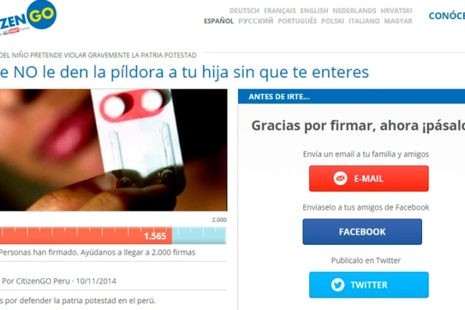 La plataforma CitizenGO denunció que en el próximo debate sobre el Código del Niño y del Adolescente en el Pleno del Congreso de Perú, programado para el 13 de noviembre, se intentaría nuevamente aprobar que se entreguen anticonceptivos a menores sin el consentimiento de sus padres.