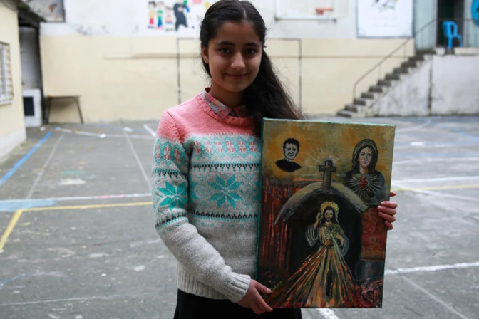 "He hecho esta pintura en nombre de nuestra escuela, para regalársela al Papa Francisco. Esta es mi pintura: aquí aparece Jesús y aquí Don Bosco. Aquí nosotros tenemos el brillo de Don Bosco y aquí el sol de Jesús, porque necesitamos la paz para nuestro país", explicó Sara a ACI Prensa/EWTN Noticias el 27 de noviembre en Estambul.