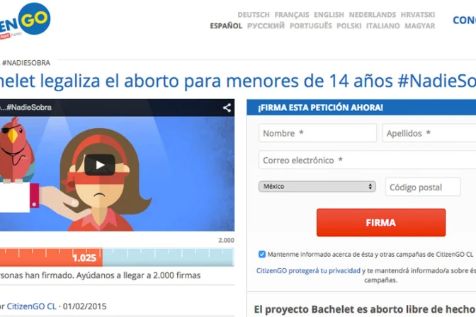 La plataforma pro-vida CitizenGO en Chile lanzó una campaña de recolección de firmas en la que denuncia que el proyecto de ley presentado por la presidenta del país, Michelle Bachelet, "legaliza de hecho el aborto libre".
