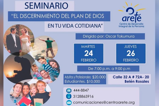 Diariamente las personas se encuentran ante situaciones o circunstancias que exigen de ellas decisiones pequeñas o grandes respecto a los más diversos temas como el dinero, la familia, los estudios, el trabajo, entre otros. Por ello y para ayudar a tener un mejor entendimiento de lo que significa el discernimiento cotidiano, el Centro Areté en Colombia organiza el seminario titulado "El discernimiento del Plan de Dios en tu vida cotidiana".