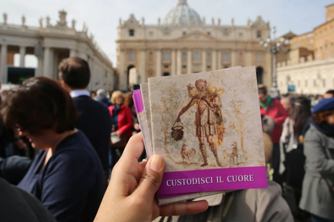 "Por eso, en este primer domingo, he pensado en regalarles a ustedes que están aquí en plaza, un pequeño libro de bolsillo titulado 'Custodia el corazón'".