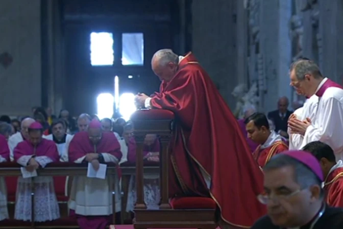 Así, revestido con una casulla de color rojo que representa a la sangre del martirio, el Santo Padre realizó el gesto de la postración frente al Altar de la Confesión de la basílica y oró durante varios minutos. Más tarde, fue ayudado a levantarse por dos ceremonieros pontificios, para dar inicio a la celebración que incluye la liturgia de la palabra y la adoración de la Cruz.