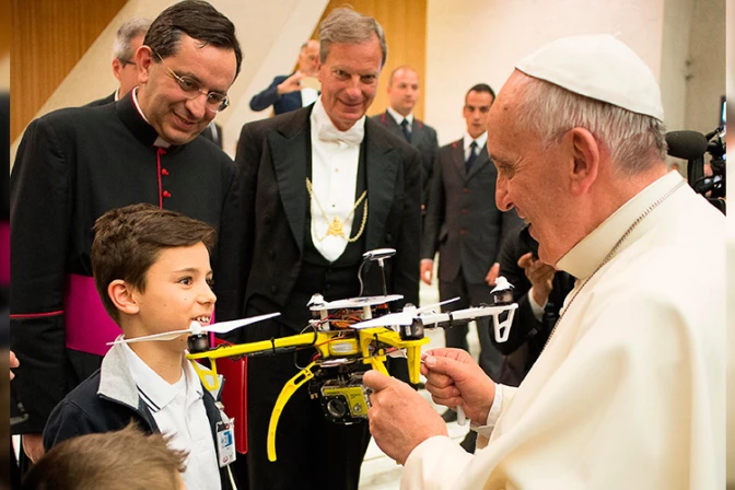 Un dron –vehículo aéreo no tripulado– se elevó durante unos segundos en el Aula Pablo VI del Vaticano este jueves por la mañana. Se trató de un divertido regalo que un grupo de estudiantes de una escuela jesuita de Roma presentó al Papa Francisco durante el encuentro con la Comunidad de Vida Cristiana en Italia y la Liga Misionera de Estudiantes italianos.
