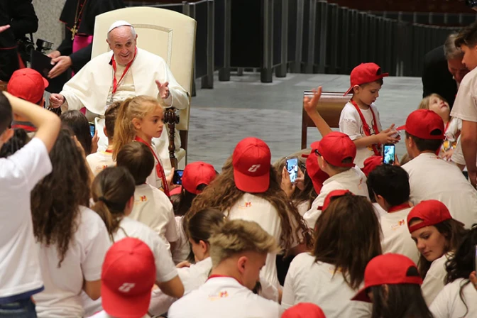 Los niños rodearon al Papa Francisco en la entrada del Aula Pablo VI del Vaticano. Habló, se rió con ellos y les hizo algunas preguntas que los pequeños respondieron divertidos. Fue una auténtica fiesta en la que no faltaron las fotografías con el Santo Padre, que les atendió con abrazos y muchas sonrisas.