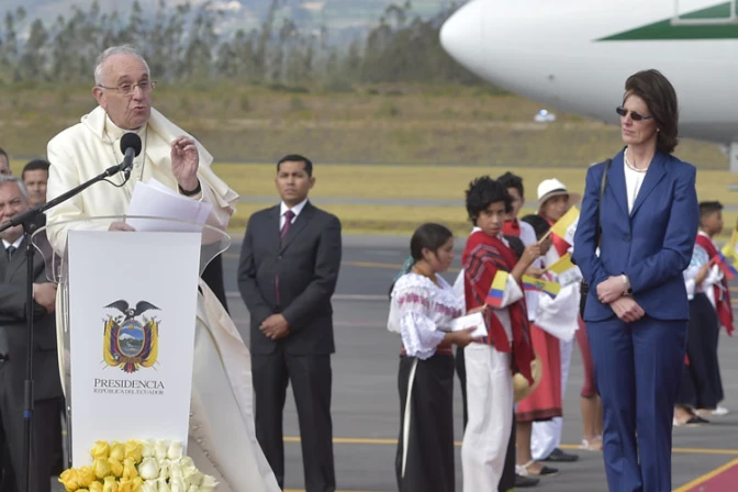El Papa Francisco inició este domingo su visita apostólica a Ecuador y dirigió un breve discurso durante la ceremonia de bienvenida en el Aeropuerto Internacional Mariscal Sucre en Quito, en el que afirmó que llega "como testigo de la misericordia de Dios y de la fe en Jesucristo", exhortó a cuidar a niños, jóvenes y ancianos; y aseguró que en el Evangelio se pueden encontrar "las claves que nos permitan afrontar los desafíos actuales".